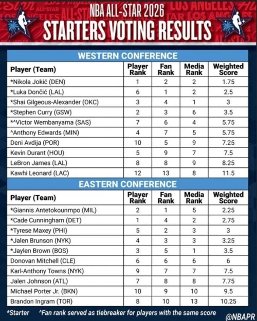 Стартовые составы от каждой конференции были выбраны в результате голосования фанатов (50%), игроков (25%) и представителей медиа (25%).
