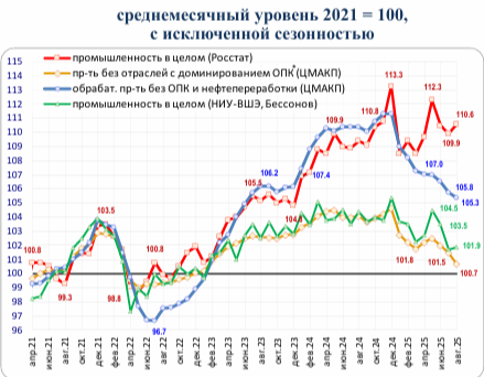 Почему нельзя дальше давить на бизнес. График промпроизводства в России: avatars.dzeninfra.ru/get-zen_doc/271828/pub_68fb0e С октября 2024 года гражданские сектора деградируют (синий график).